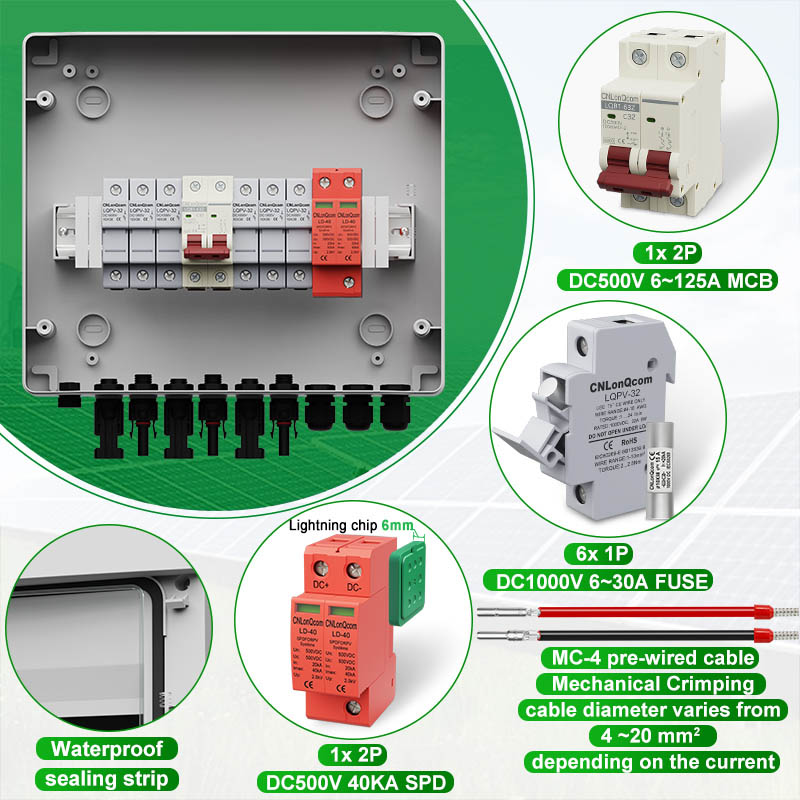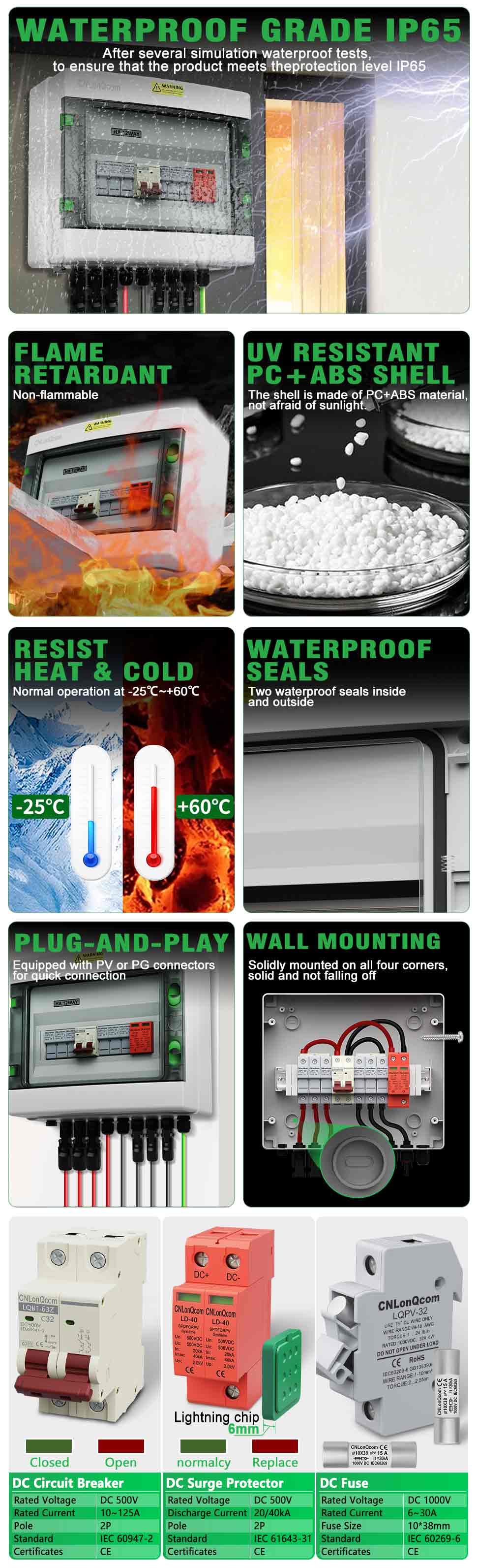 CNLONQCOM IP65 PV combiner Boîte 3 en 1 OUT DC500V / 600V / 800V avec disjoncteur et protection contre la foudre et fusibles pour les systèmes DC à panneau solaire extérieur, RV, maisons, bateaux