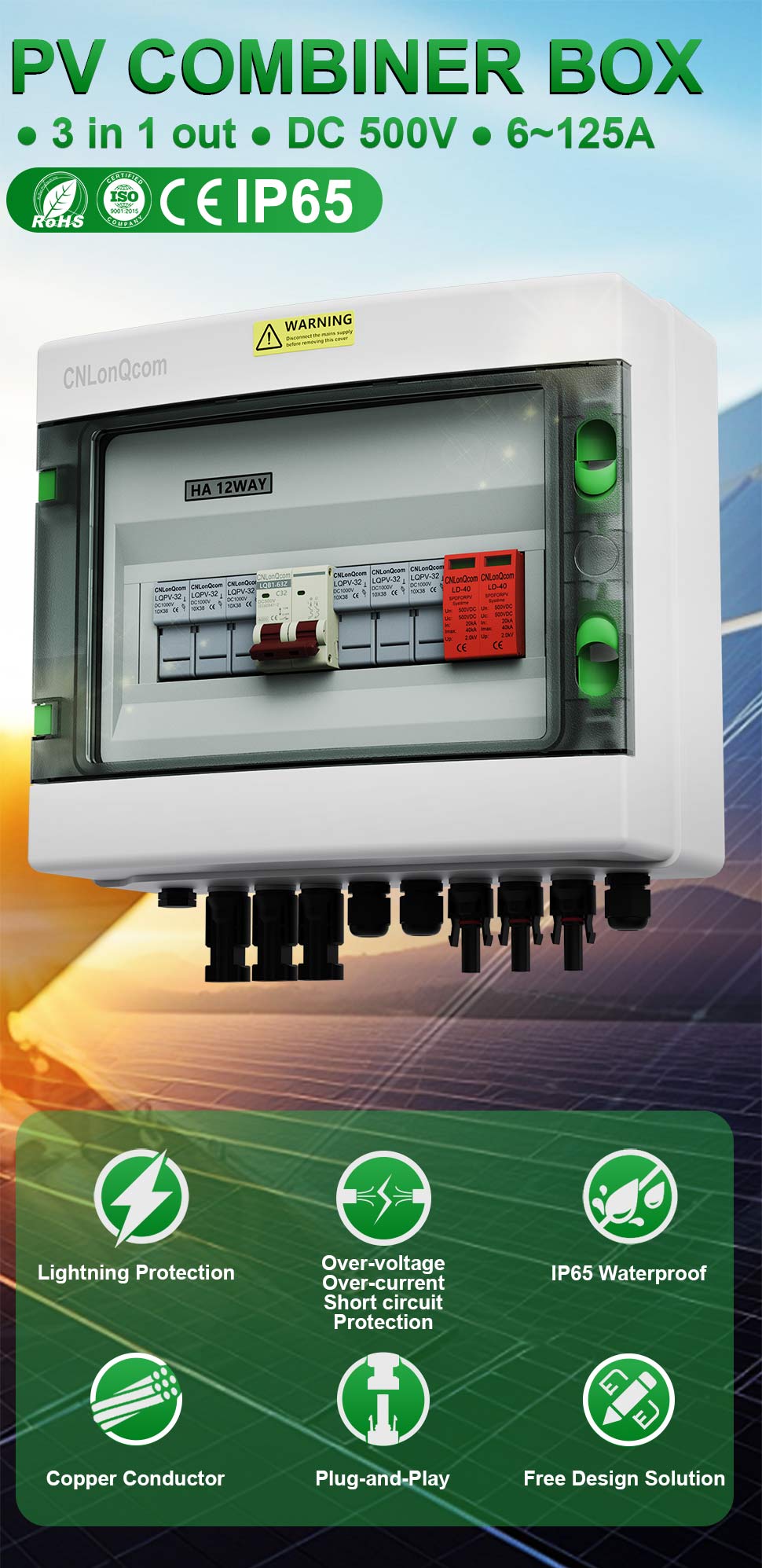 Boîte de combinaison PV en plastique HA de la série HA de CNlonqcom Box 3 en 1 OUT DC500V dispose d'un boîtier imperméable PC + ABS avec construction scellée, protection contre les surcharges, protection contre les courts-circuits, protection contre la surtension, poussière, humidité et protection contre la foudre.