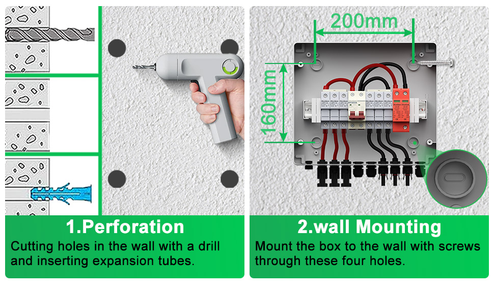 Montez la boîte sur le mur avec des vis à travers ces quatre trous.